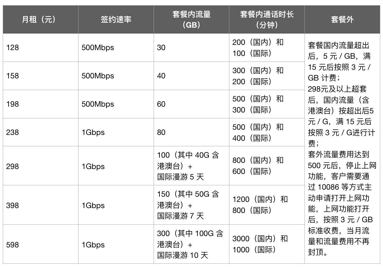 和联通相比,移动各档套餐的月租乍一看还便宜了 1 块钱,但其实中国移动 198 元档的套餐签约速率仍然为 500Mbps,而这个价位的联通套餐签约速率已经是 1Gbps。