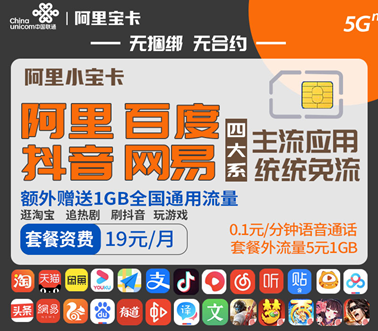 中国联通正式推出的阿里小宝卡是针对阿里系、字节系、网易系三大系免流,免流范围更广,几乎涵盖了时下所有常用APP,支持5G信号。